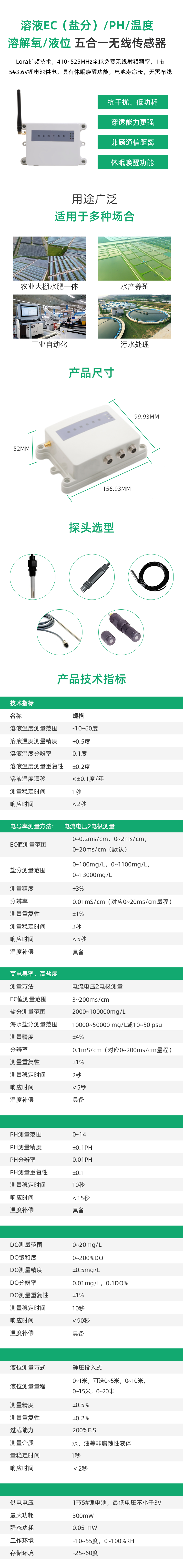 溶液EC(鹽分)、PH、溫度、溶解氧、液位五合一無(wú)線傳感器