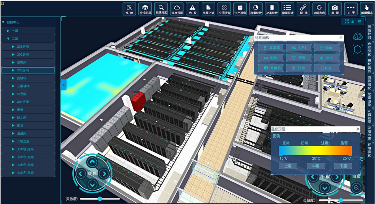 智慧機房采用三維可視化技術(shù),對機房內(nèi)環(huán)境及動力設(shè)備逐一進行三維建模,融合大數(shù)據(jù)和人工智能技術(shù),構(gòu)建多維度分層呈現(xiàn)的虛擬現(xiàn)實環(huán)境。通過監(jiān)控大屏,可以清晰明了的對機房環(huán)境、門禁、配電、消防、視頻等重點內(nèi)容進行綜合可視化管理。