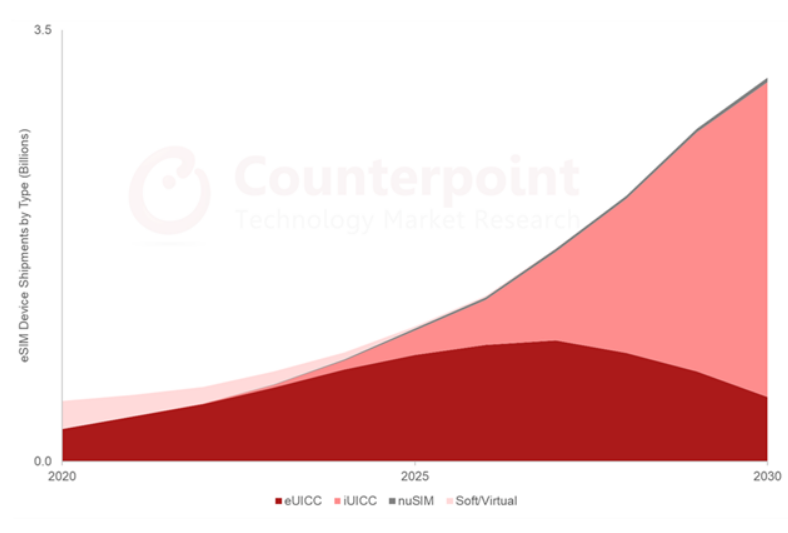 2022年7月,研究機(jī)構(gòu) Counterpoint 在其關(guān)于eSIM設(shè)備的市場展望報(bào)告中稱:在 2021 年智能手機(jī)、物聯(lián)網(wǎng)和車聯(lián)網(wǎng)等領(lǐng)域帶動(dòng)下,eSIM 硬件設(shè)備出貨量超過 3.5 億臺(tái),預(yù)計(jì) 2021-2030 年將有累積超過 140 億臺(tái) eSIM 設(shè)備出貨,包括 eSIM (eUICC)、iSIM (iUICC)、nuSIM 和 Soft SIM 等各細(xì)分形態(tài)產(chǎn)品。