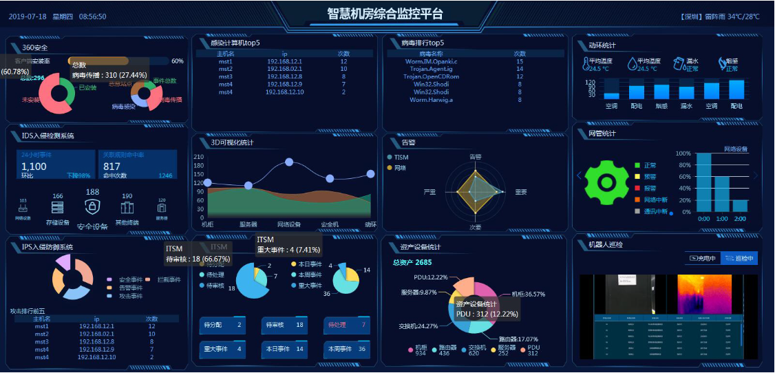 作為數(shù)據(jù)儲(chǔ)存及信息系統(tǒng)的核心部分,機(jī)房的安全運(yùn)維成為了重中之重,機(jī)房?jī)?nèi)配套的動(dòng)力系統(tǒng)、環(huán)境系統(tǒng)、消防系統(tǒng)都需要處于時(shí)刻受控、穩(wěn)定運(yùn)行狀態(tài)。為此,能夠?qū)⒄麄€(gè)機(jī)房的設(shè)備及動(dòng)力環(huán)境集成到一個(gè)平臺(tái)上進(jìn)行統(tǒng)一實(shí)時(shí)監(jiān)控管理并及時(shí)偵測(cè)故障告警的機(jī)房動(dòng)環(huán)監(jiān)控系統(tǒng)應(yīng)運(yùn)而生。技術(shù)更為先進(jìn)的三維可視化功能應(yīng)用到機(jī)房動(dòng)環(huán)監(jiān)